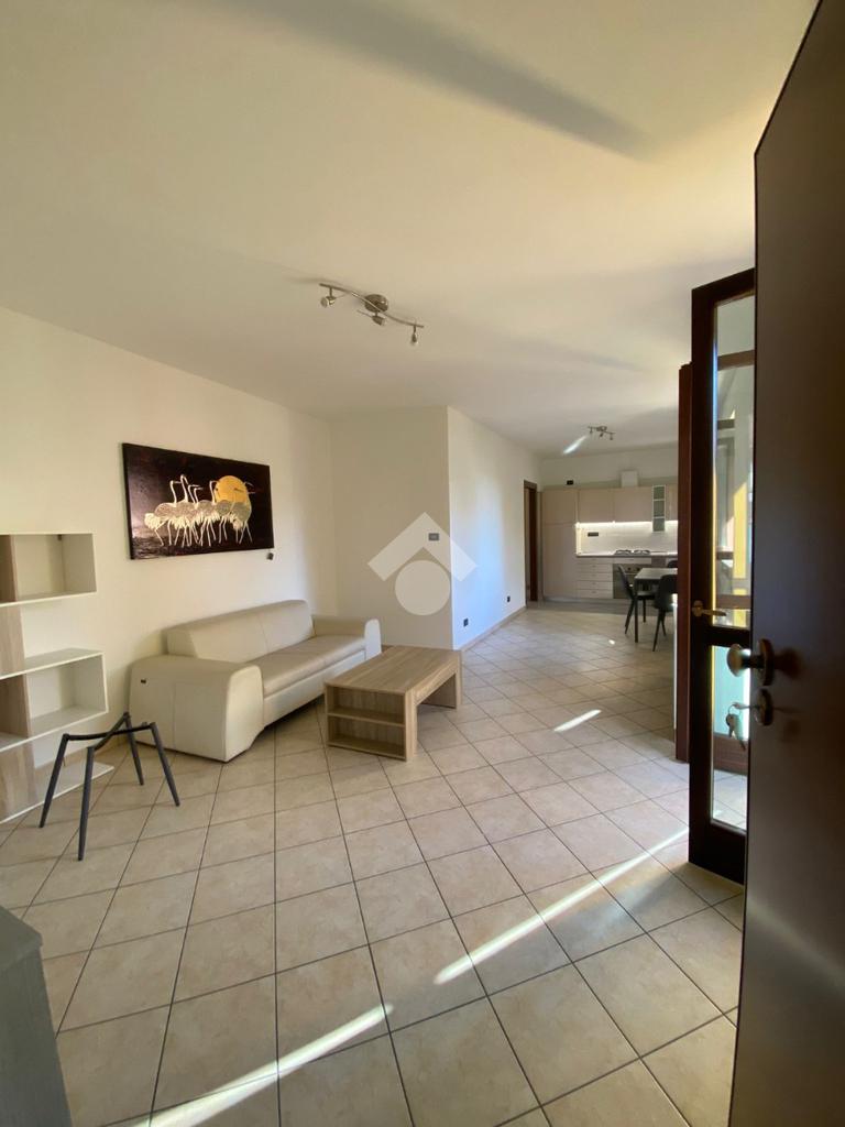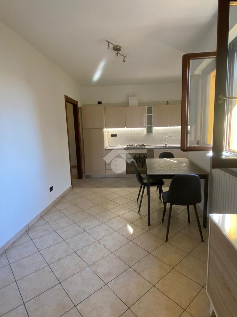 L'alloggio si trova al primo piano e comprende soggiorno con cucina a vista, due camere da letto e un bagno finestrato.